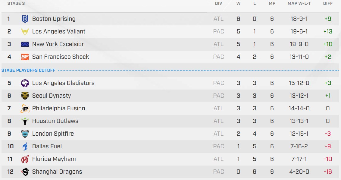 Los Angeles Gladiators 2:3 Los Angeles ValiantDallas Fuel 0:4 San Francisco ShockShanghai Dragons 1:3 Seoul Dynasty