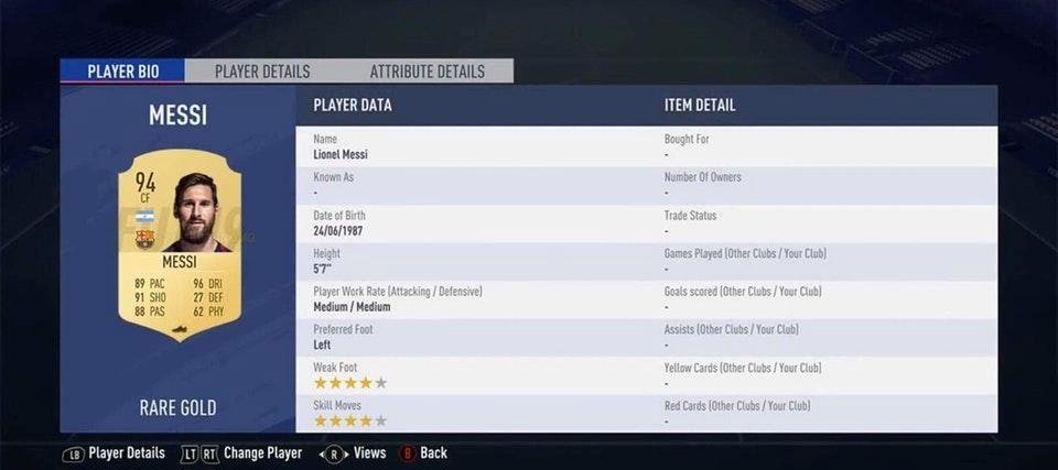 В сеть попал скриншот карточки Лионеля Месси в FIFA 19.