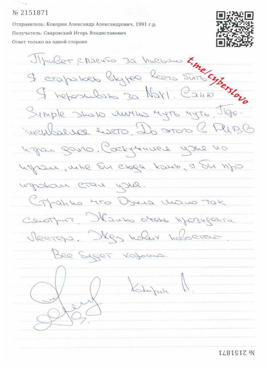 «Привет, спасибо за письмо. Я стараюсь в курсе всего быть. Я переживаю за Na`Vi. Саню «s1mple» знаю лично чуть-чуть. Переписываемся часто.