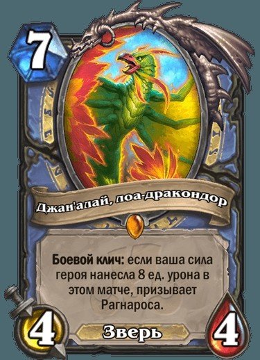 Легендарное существо Мага Джан’алай, лоа-дракондор: Боевой клич: если ваша сила героя нанесла 8 урона в этом матче, призывает Рагнароса.