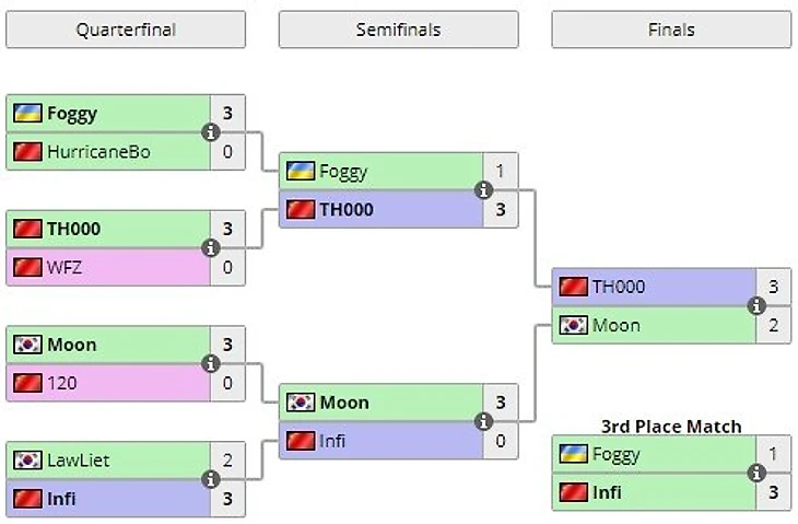 Победителем турнира стал TH000, в финале он победил Moon со счетом 3:2. Foggy занял 4-е место уступив в матче за бронзу Infi (1:3).