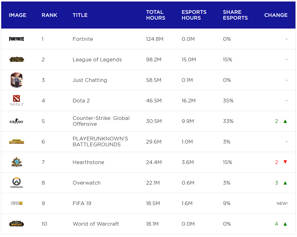 Fortnite – самая популярная игра и на Twitch (124,8 млн часов), и на Youtube (35 млн часов). League of Legends занимает второе место на Twitch (98,2 млн часов) и четвертое на YouTube (11,4 млн часов). Dota 2 – четвертая по просмотрам на Twitch (46,5 млн часов), а CS:GO – пятая на Twitch (30,5 млн часов) и десятая на YouTube (4,6 млн часов).