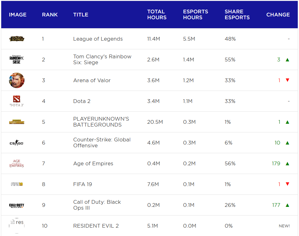 League of Legends сохранила первое место по этому показателю на YouTube (5,5 млн часов), Rainbow Six Siege поднялась на второе место (1,4 млн часов), Dota 2 осталась на четвертом месте (1,1 млн часов). CS:GO поднялась на шестое место (300 тыс. часов).