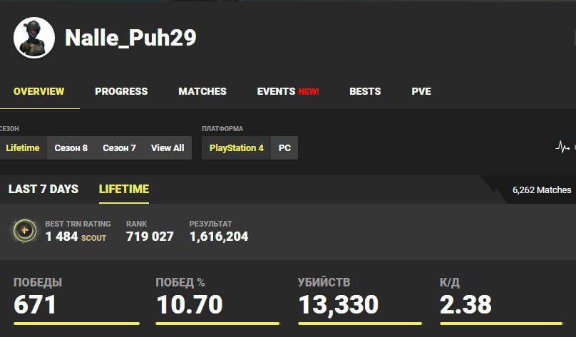 Средняя полная продолжительность матча – 20 минут, но у большинства она будет ниже, так как игрок может умереть в первые же минуты боя и сразу начать следующий. За карьеру у Патрика 6262 матча в Fortnite.