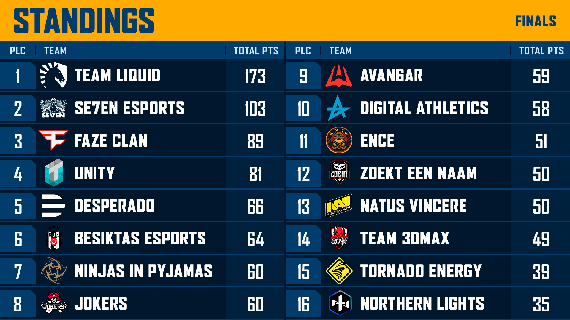 Команда с большим отрывом обогнала остальных участников, набрав 173 очка. Выигрыш Team Liquid – 50 тысяч долларов.
