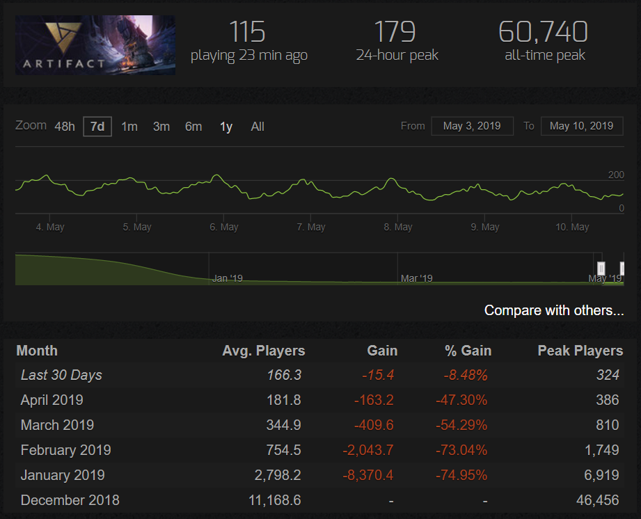 Пиковый онлайн Artifact за последние сутки опустился ниже 200 игроков. Это худший показатель за историю игры