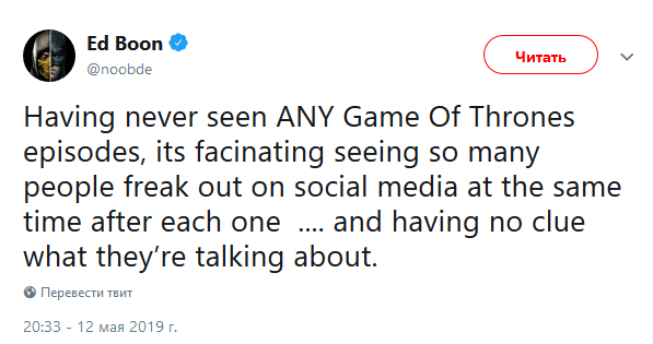 Бун написал: «Никогда не видел ни одного эпизода «Игры престолов». Очаровательно видеть, как многие люди одновременно сходят с ума в социальных сетях после каждого эпихода. И не иметь ни малейшего понятия, о чем идет речь».