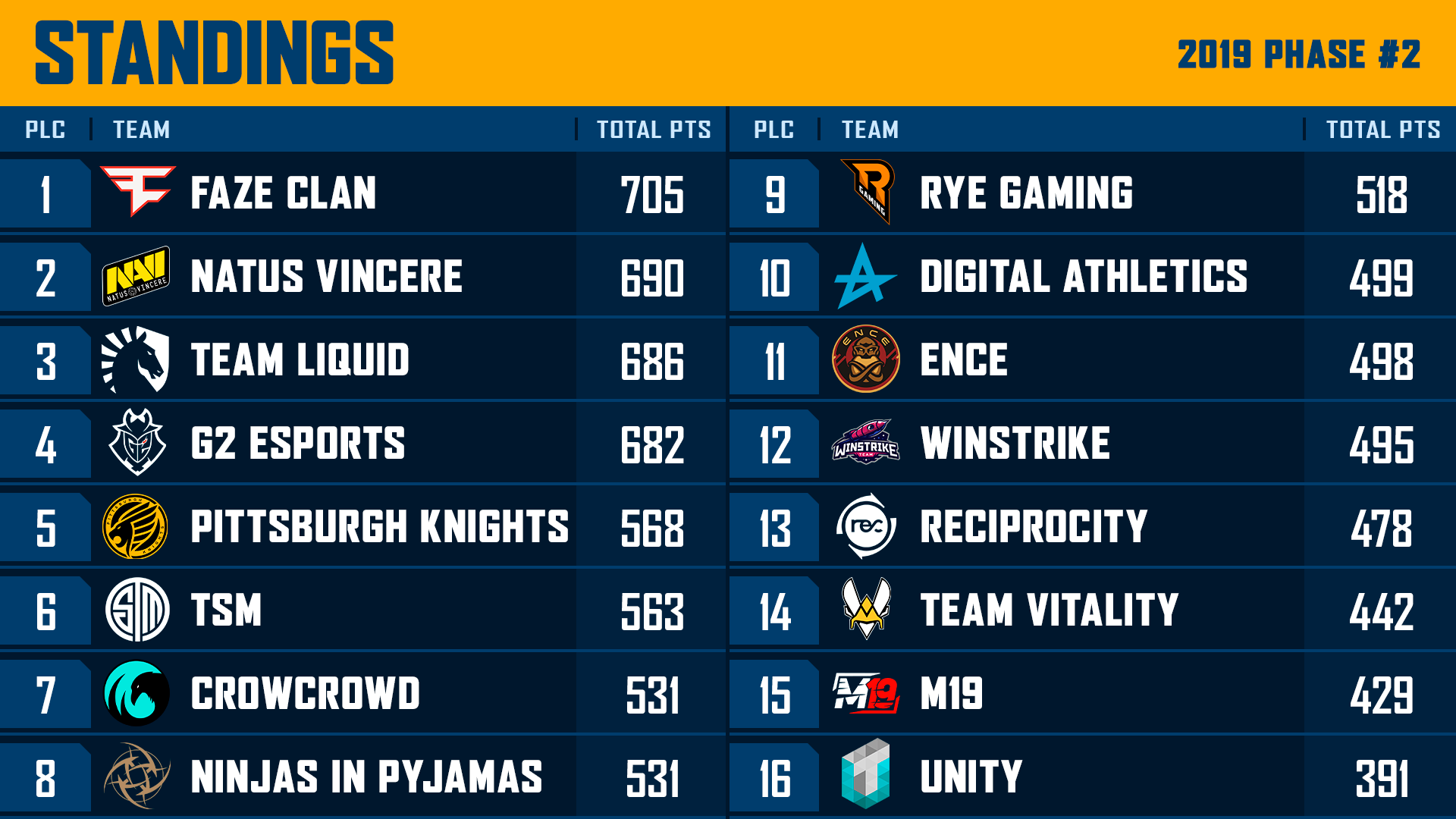Участники: Team Liquid, Faze, Pittsburgh Knights, Ninjas in Pyjamas, Natus Vincere, Team Vitality, G2 Esports, Ence, Raise Your Edge, M19, Winstrike, Digital Athletics, Team SoloMid, CrowCrowd, UNITY, Team Reciprocity