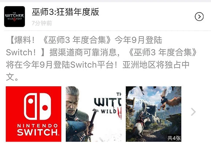 В Weibo появилось сообщение: «По словам надежного источника из дистрибьюторов, «Ведьмак 3» GOTY выйдет на Switch в сентябре. Китайская локализация будет эксклюзивна для Азии».