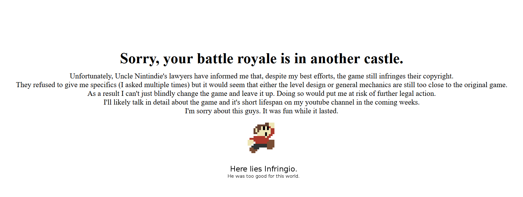 Ранее он переделал Mario Royale из-за жалобы Nintendo, изменив персонажей, уровни и звуки и переименовав игру в DMCA Royale.