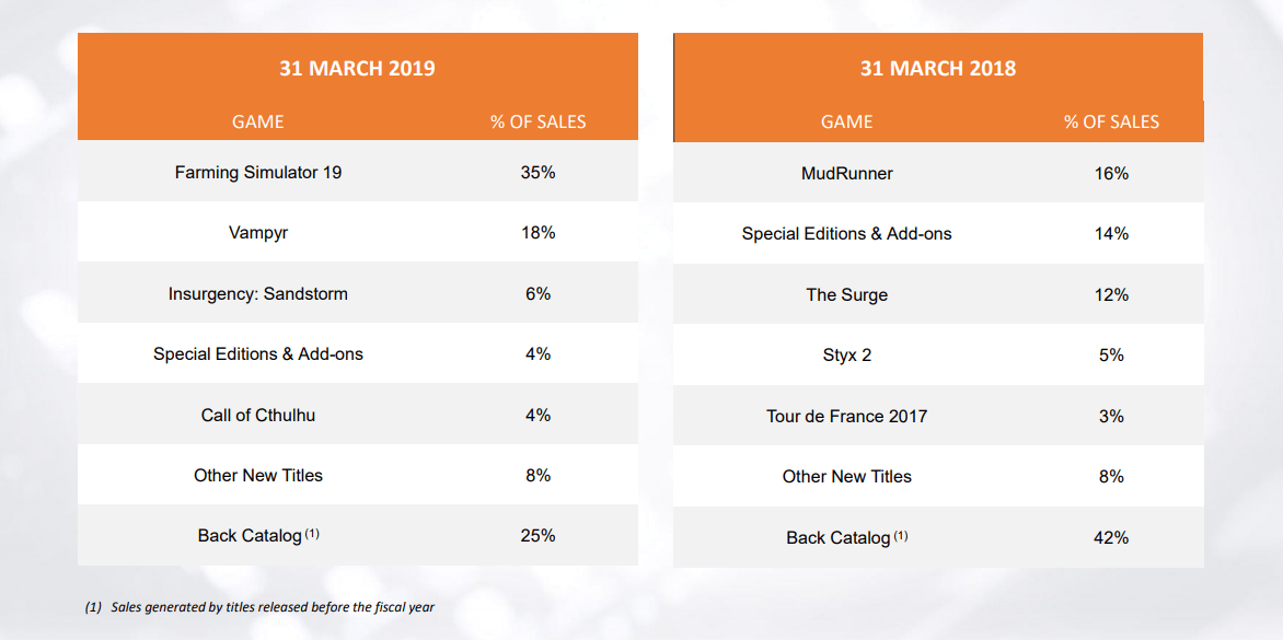Самой продаваемой игрой издательства стала Farming Simulator 19, она принесла около 35% выручки компании. На втором месте с 18% выручки находится Vampyr, а на третьем с 6% - Insurgency: Sandstorm.
