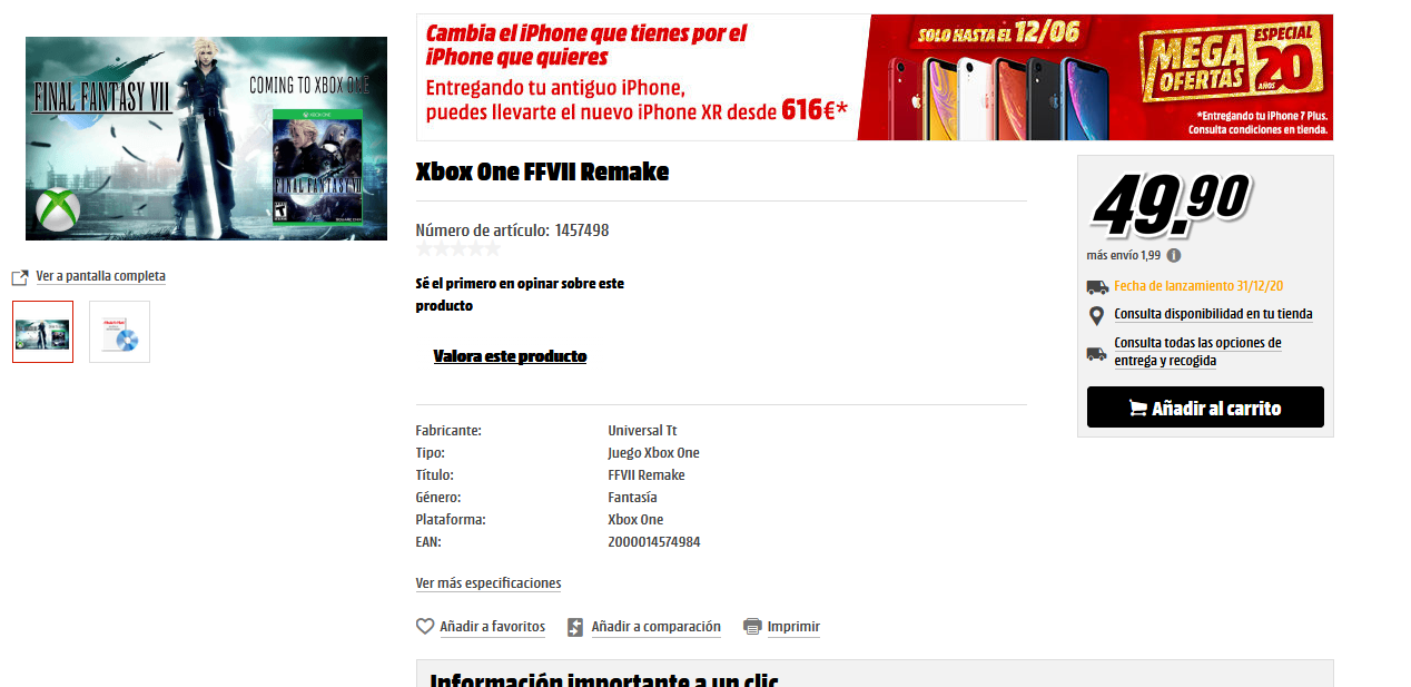 Пользователь ResetEra Xharos обнаружил Final Fantasy VII Remake для Xbox One на сайте испанского Media Markt.