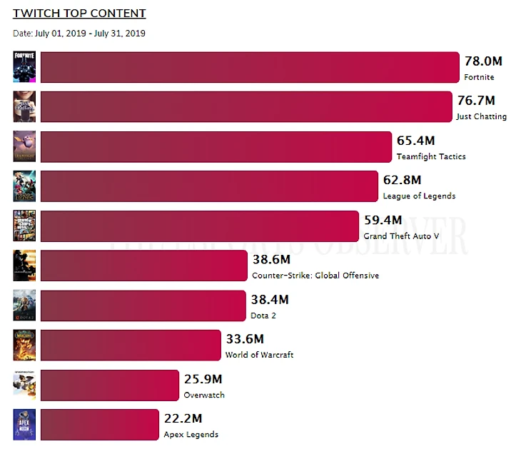 Портал The Esports Observer опубликовал статистику просмотров на Twitch за июль. В указанный период самой популярной игрой на стриминговой платформе стала Fortnite. Суммарно она набрала 78 млн часов просмотра. Ненамного отстал раздел Just Chatting, используемый для общения – 76,7 млн часов. Третье место заняла Teamfight Tactics, обошедшая League of Legends – 65,4 млн против 62,8 млн часов.