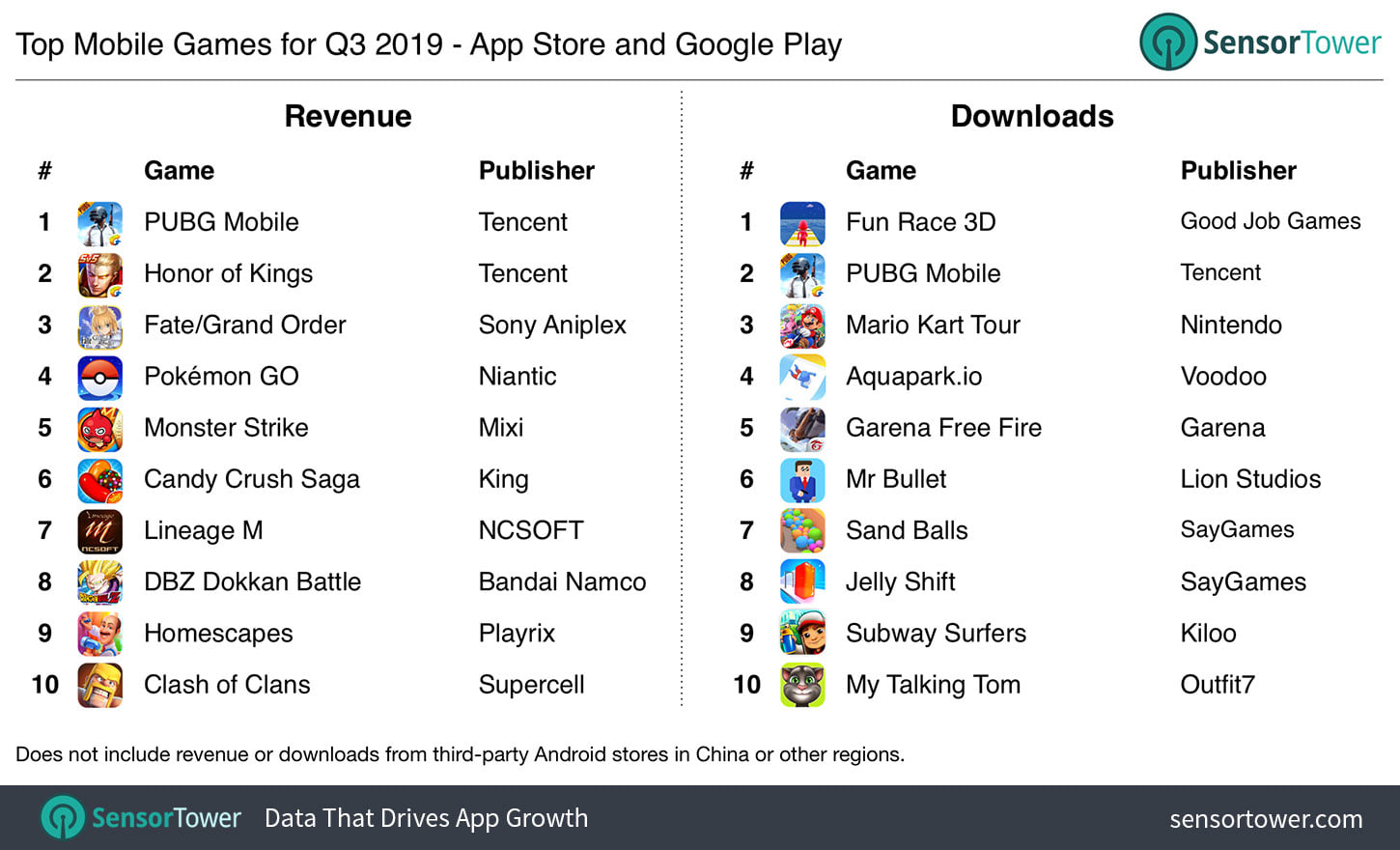 Mario Kart Tour от Nintendo заняла третье место в чарте установок (86 млн). Игра вышла 25 сентября. Mario Kart Tour не попала в топ-100 самых прибыльных игр. PUBG Mobile лидирует по прибыли – 496 млн долларов за третий квартал 2019 года (доход вырос на 652%). Honor of Kings и Aniplex’s Fate/Grand Order принесли 377 млн и 354 млн соответственно. Выручка Pokemon GO – 308 млн. Fun Race 3D скачали 123 млн раз, игра обошла PUBG Mobile почти на 29 млн первичных установок.