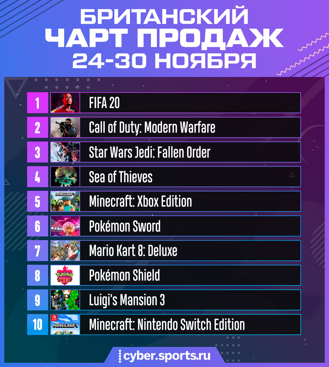 FIFA 20 возглавила чарт, за неделю продажи выросли на 226%. Call of Duty: Modern Warfare заняла второе место (продажи увеличились на 86%). Star Wars Jedi: Fallen Order упала на третье место, однако продажи выросли на 32%.