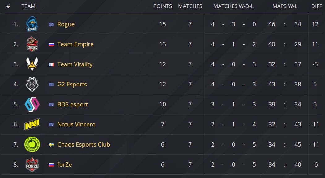 Участники европейского дивизиона: Chaos, Empire, G2, NAVI, Rogue, Vitality, BDS, Forze.