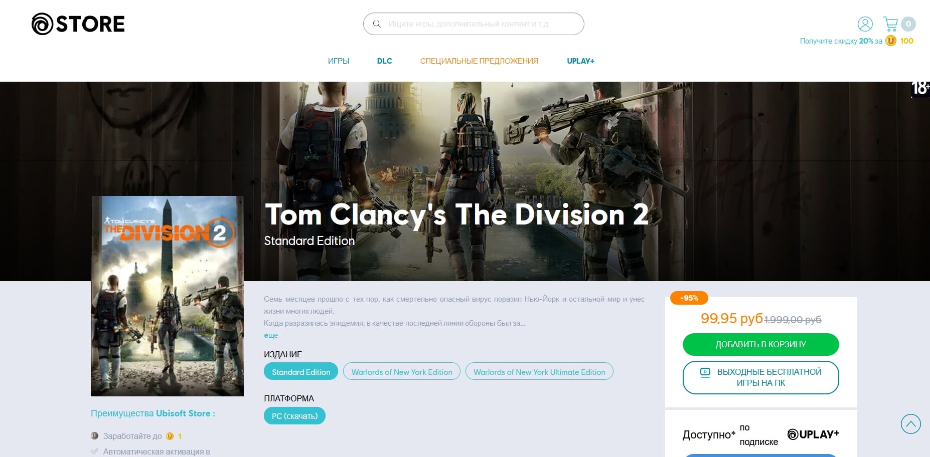 Tom Clancy’s The Division 2 продается за 100₽ в магазине Ubisoft. Обычная стоимость – 1999₽