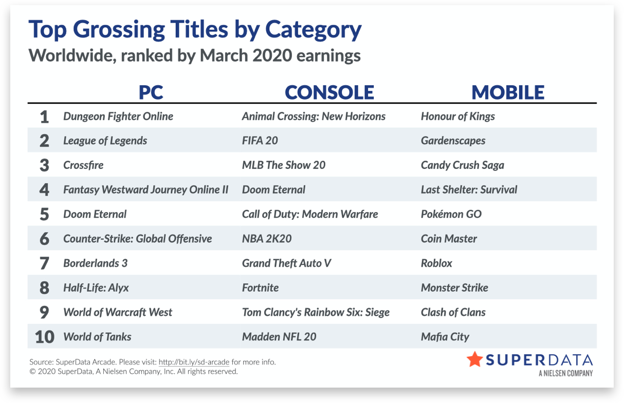 Самой успешной игрой для смартфонов за март стала китайская MOBA Honour of Kings, среди игр на PC лидирует Dungeon Fighter Online, которая обошла League of Legends и релизы Doom Eternal и Half-Life: Alyx.