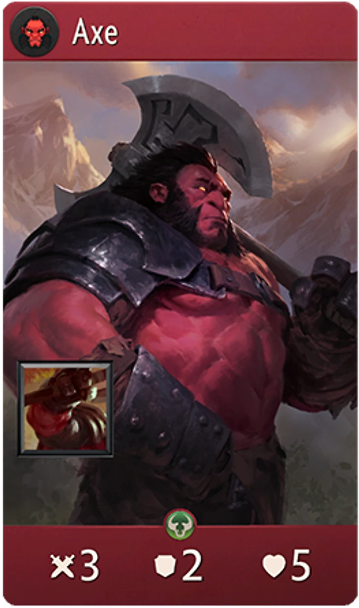 • Хотя характеристики Акса уже не такие устрашающие, он остался стойким героем с широкими возможностями при размещении.• Если подготовить поле, «Нещадный топор» срубит головы нескольким героям за один раунд (повторяемая карта возвращается в вашу руку при использовании, но сбрасывается в конце раунда). А еще весело притворяться, что у вас есть эта карта, и заставлять противника защищаться от нее.• «Клич берсерка» по-прежнему зверски силен, и из-за него предметы у Акса становятся еще важнее. Не советуем упускать инициативу, когда на поле боя выходит Акс, готовый применить эту способность.