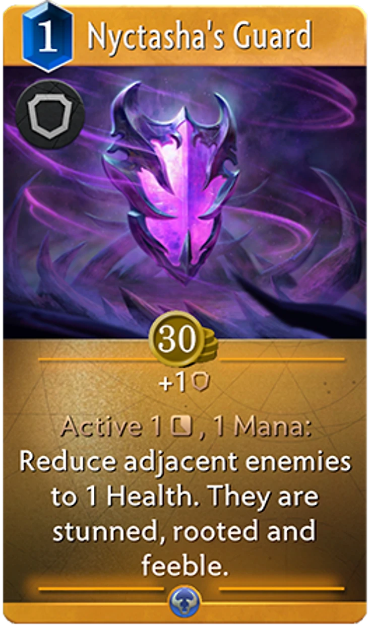 • Очевидно, этот предмет следует древнему завету: лучшая защита — нападение.• Владелец этого щита становится серьезной угрозой. Прежде чем использовать его, постарайтесь выманить ответные карты противника.