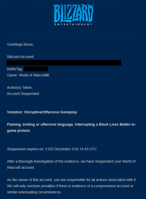 В сообщении Blizzard говорится, что он флеймил, троллил или использовал оскорбительные слова, а также мешал проведению внутриигрового протеста Black Lives Matter.