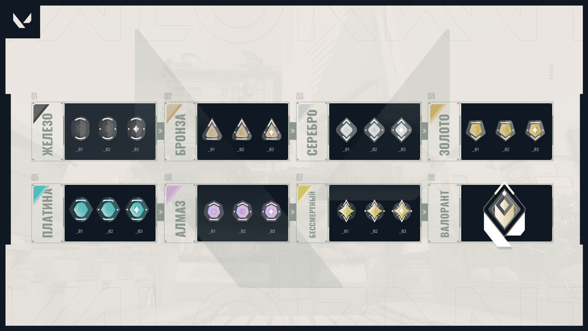 В Valorant 8 рангов, все, кроме последнего, имеют три подуровня.
