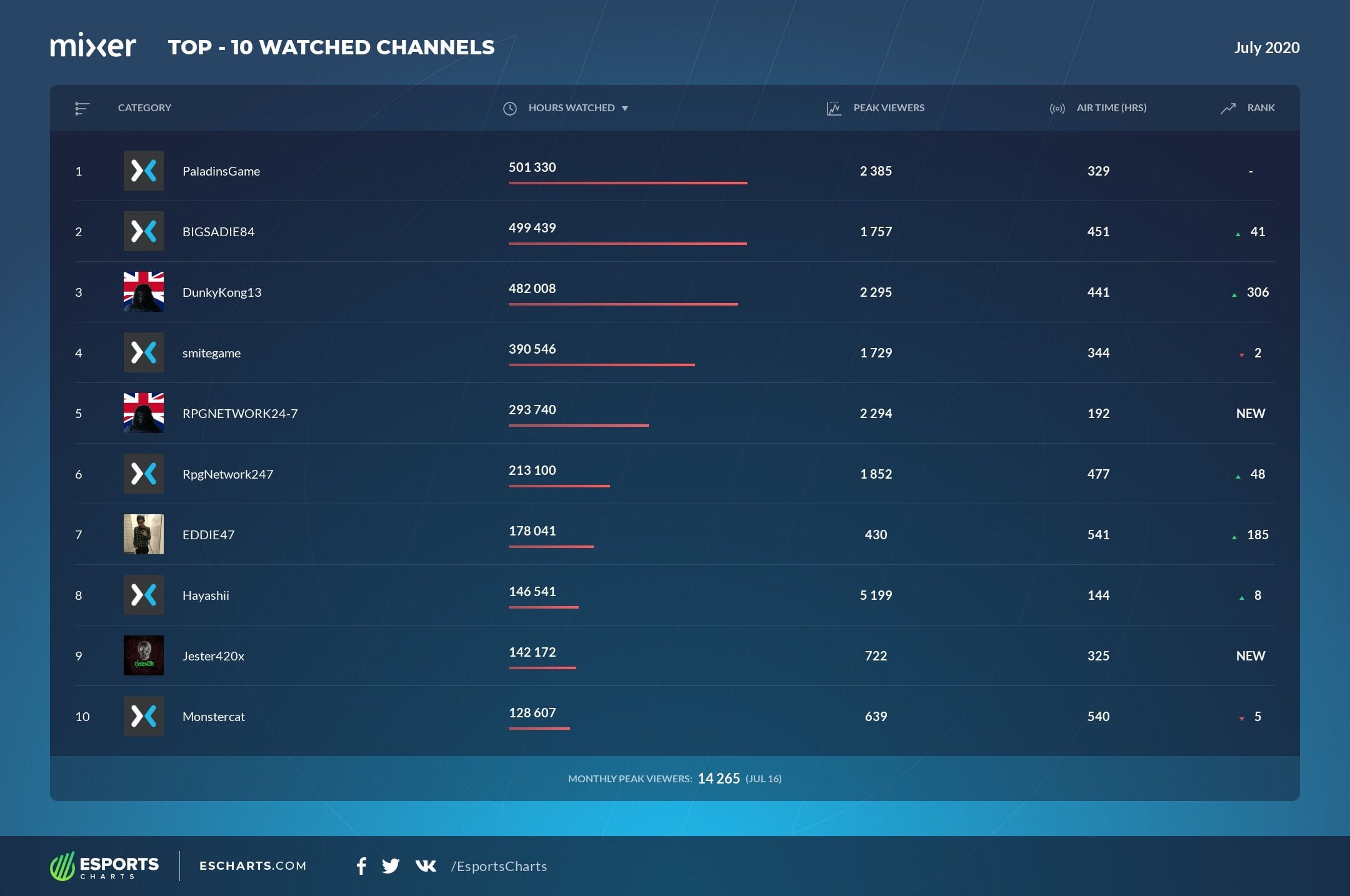 Сайт Esports Charts опубликовал статистику самых популярных каналов на Mixer в июле – последнем месяце существования сервиса.