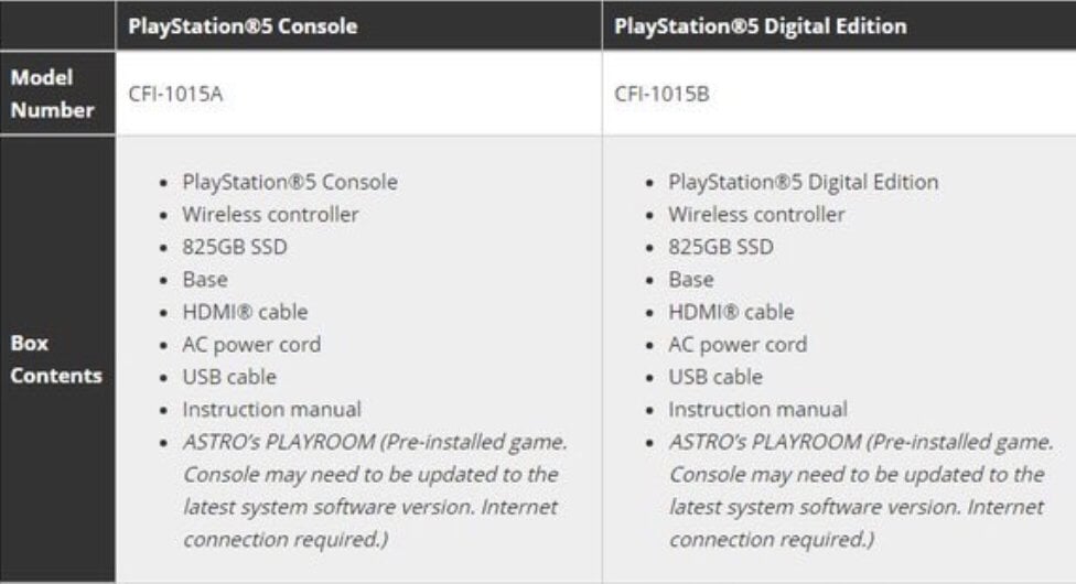 Комлектация обеих версий консолей не отличается. Предполагатся, что модель PlayStation 5 с дисководом выпустили под номером «CFI-1015A», а цифровую версию «CFI-1015B». Комплектация PlayStation 5