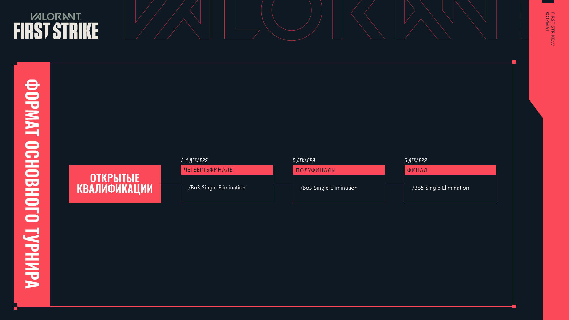 Проведут две квалификации на 512 составов. Команды играют до первого поражения. Когда на отборе останется 32 состава, они сразятся в плей-офф в Bo3-матчах. Топ-4 каждой из квалификаций выйдут на Valorant First Strike.