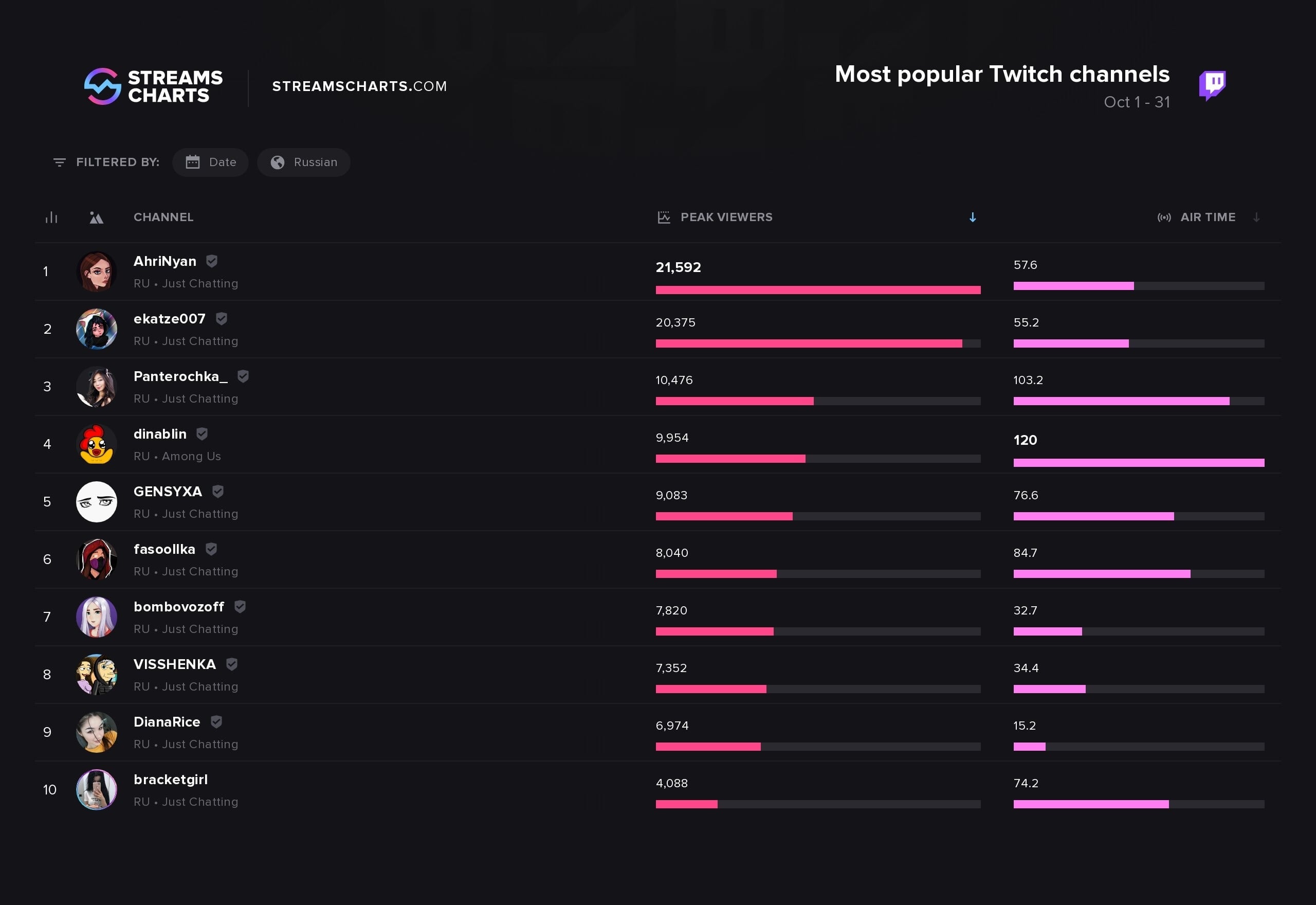 По пиковому числу зрителей всех опередила AhriNyan – ее в один момент смотрели 21,6 тысячи человек. Второе место по пику занимает Ekatze007 (20 тысяч зрителей), а третье – Panterochka_ (10,6 тысячи).