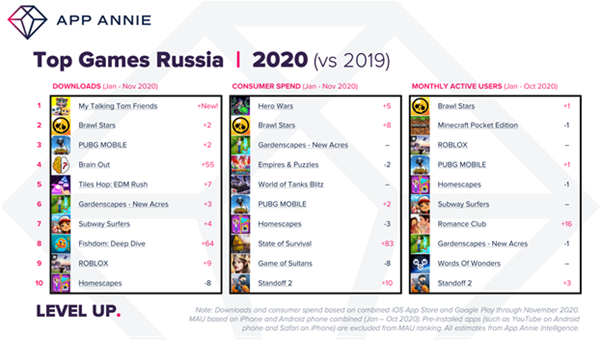 Самой популярной игрой в мире по количеству загрузок стала Free Fire, по тратам пользователей – Honor of Kings, а по количеству активных пользователей – PUBG Mobile. В России лидируют «Говорящий Том и его друзья» (по скачиваниям), Hero Wars (по тратам) и Brawl Stars (по онлайну).