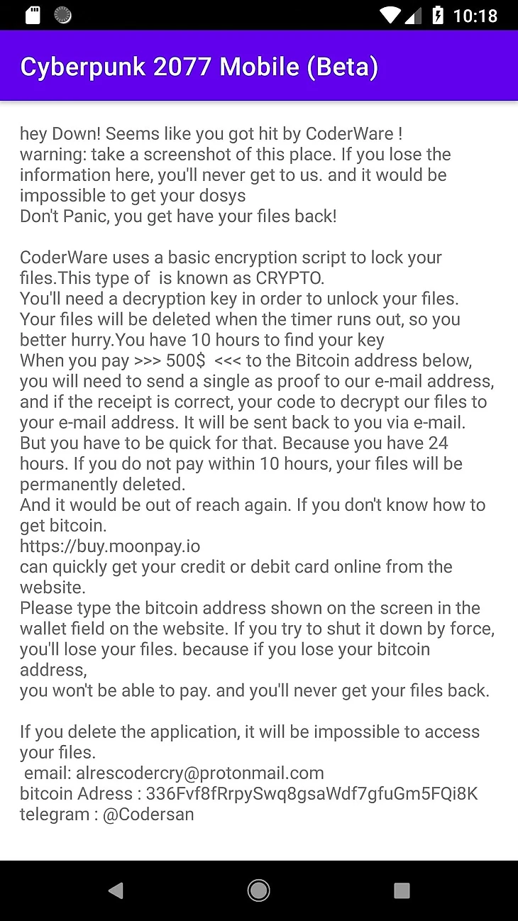 • Появился вирус-вымогатель, который притворяется мобильной версией Cyberpunk 2077