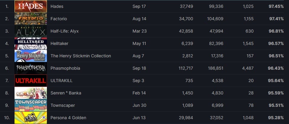 Сейчас у Hades 97,45 положительных отзывов. В топ-3 также попали Factorio и Half-Life:Alyx.