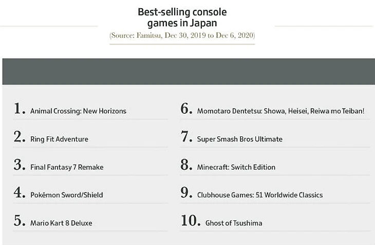В Японии самой популярной игрой для консолей стала Animal Crossing: New Horizons. Ring Fit Adventure заняла вторую строчку, тройку замкнула Final Fantasy 7 Remake.