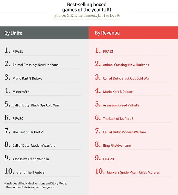 Список игр с наибольшим доходом в Великобритании за 2020-й также возглавила FIFA 21, Animal Crossing: New Horizons и Call of Duty: Black Ops Cold War вошли в тройку лучших. Сайт отмечает, что оба списка приводят данные лишь по физическим копиям игр.
