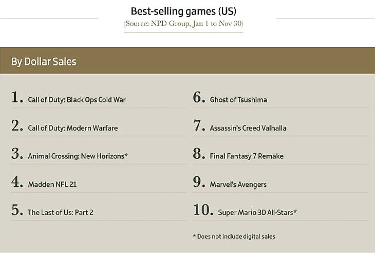 В США самой продаваемой игрой года вне зависимости от формата копий стала Call of Duty: Black Ops Cold War. Еще одна игра серии CoD – Modern Warfare стала второй, третьей Animal Crossing: New Horizons.