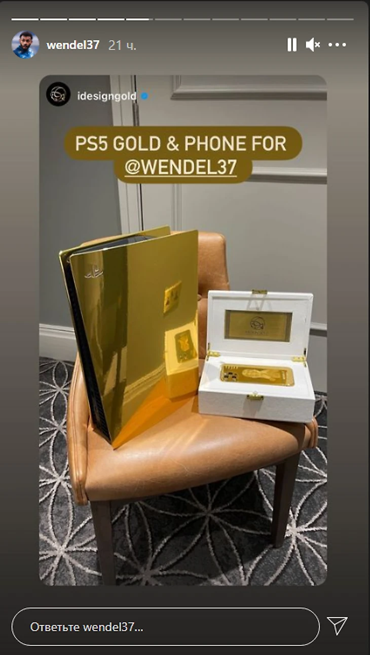 Вендел репостнул в сторис фото золотых PlayStation 5 и IPhone 12, которые были сделаны для бразильца компанией IDesign Gold.