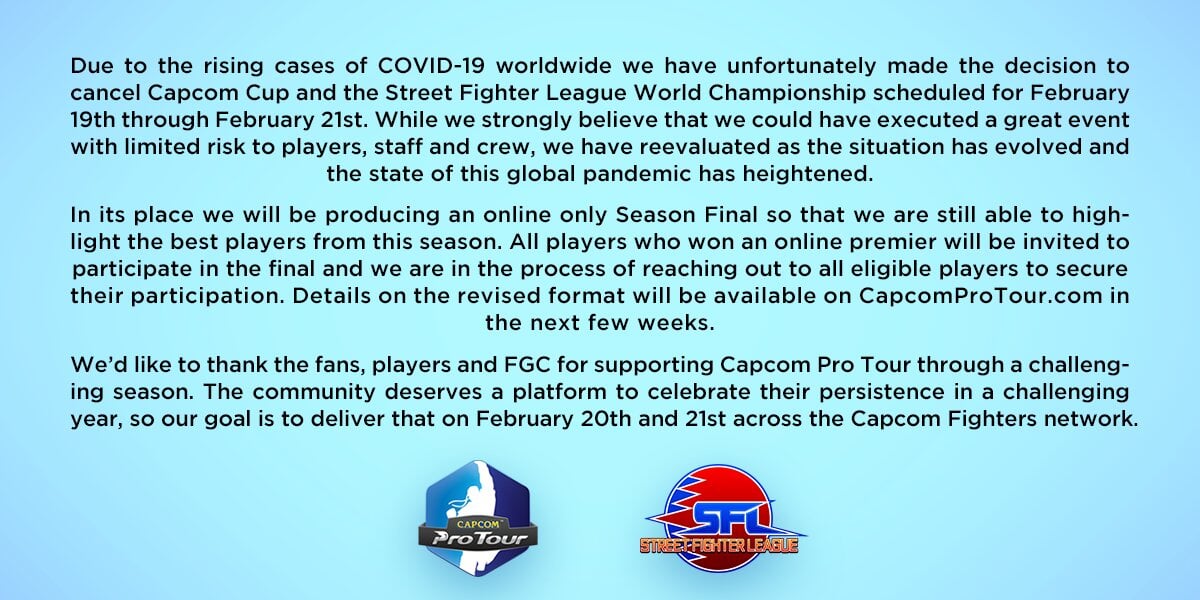 Компания Capcom сообщила в твиттере об отмене турниров Street Fighter League World Championship и Capcom Cup.