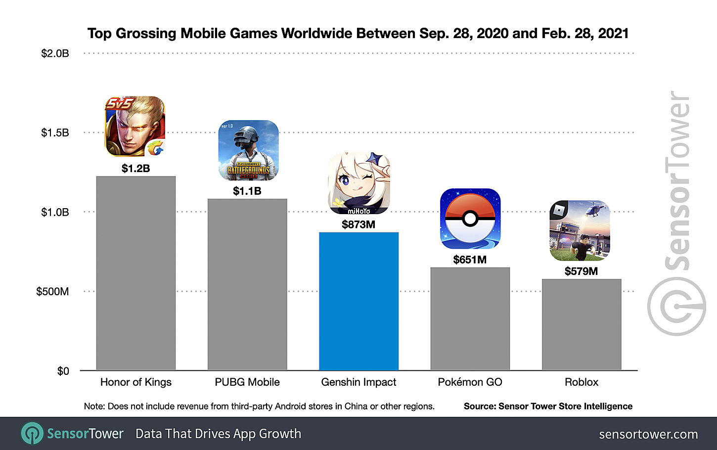 Проект студии miHoYo принес разработчикам 873 млн долларов. В список также вошли Honor of Kings, PUBG Mobile, Pokemon Go и Roblox.