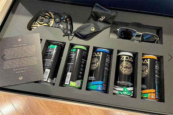 ZOA Energy – бренд энергетических напитков, который принадлежит Джонсону. Помимо мини-холодильника, в набор презентов вошел контроллер Xbox, очки и шесть банок напитков.