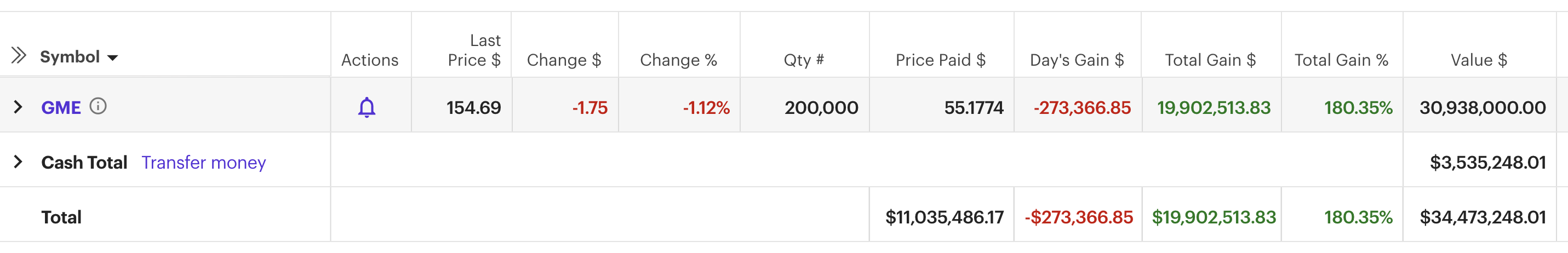 Помимо исполнения опционов, трейдер приобрел еще 50 тысяч акций GameStop. Сейчас его доля равна 200 тысячам акций на сумму более 30 млн долларов. В пятницу акции GameStop закрылись на отметке в 154,69 доллара – это значит, что чистая прибыль трейдера составила почти 20 млн долларов.