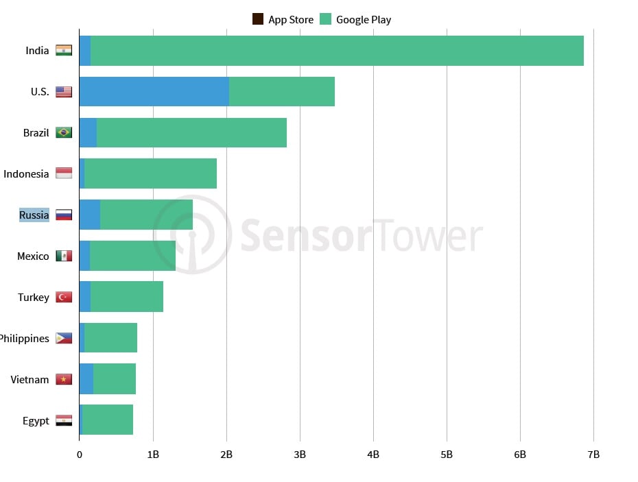 Почти 7 млрд загрузок совершили жители Индии, США стала второй в рейтинге с 3,5 млрд. Россия (1,6 млрд загрузок) заняла 5-е место, уступив Бразилии и Индонезии.