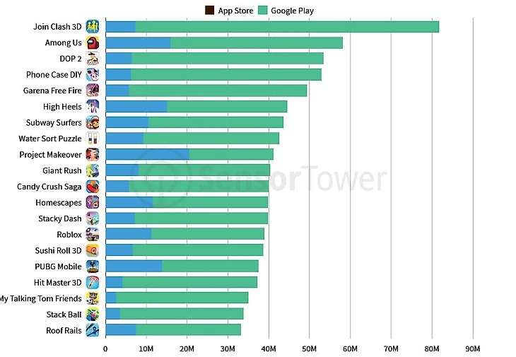 Самыми загружаемыми играми в начале 2021 года стали Join Clash 3D; Among Us и DOP 2, в топ-5 также попала Garena Free Fire.