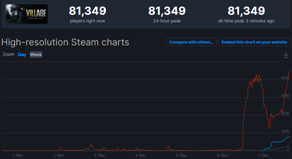 На данный момент пиковый онлайн хоррора превышает 81 тысячу игроков. Предыдущий рекорд принадлежит ремейку Resident Evil 2 – 74 тысячи человек.