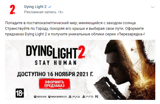 В социальной сети ВКонтакте появилась реклама с датой выхода экшена про зомби Dying Light 2.