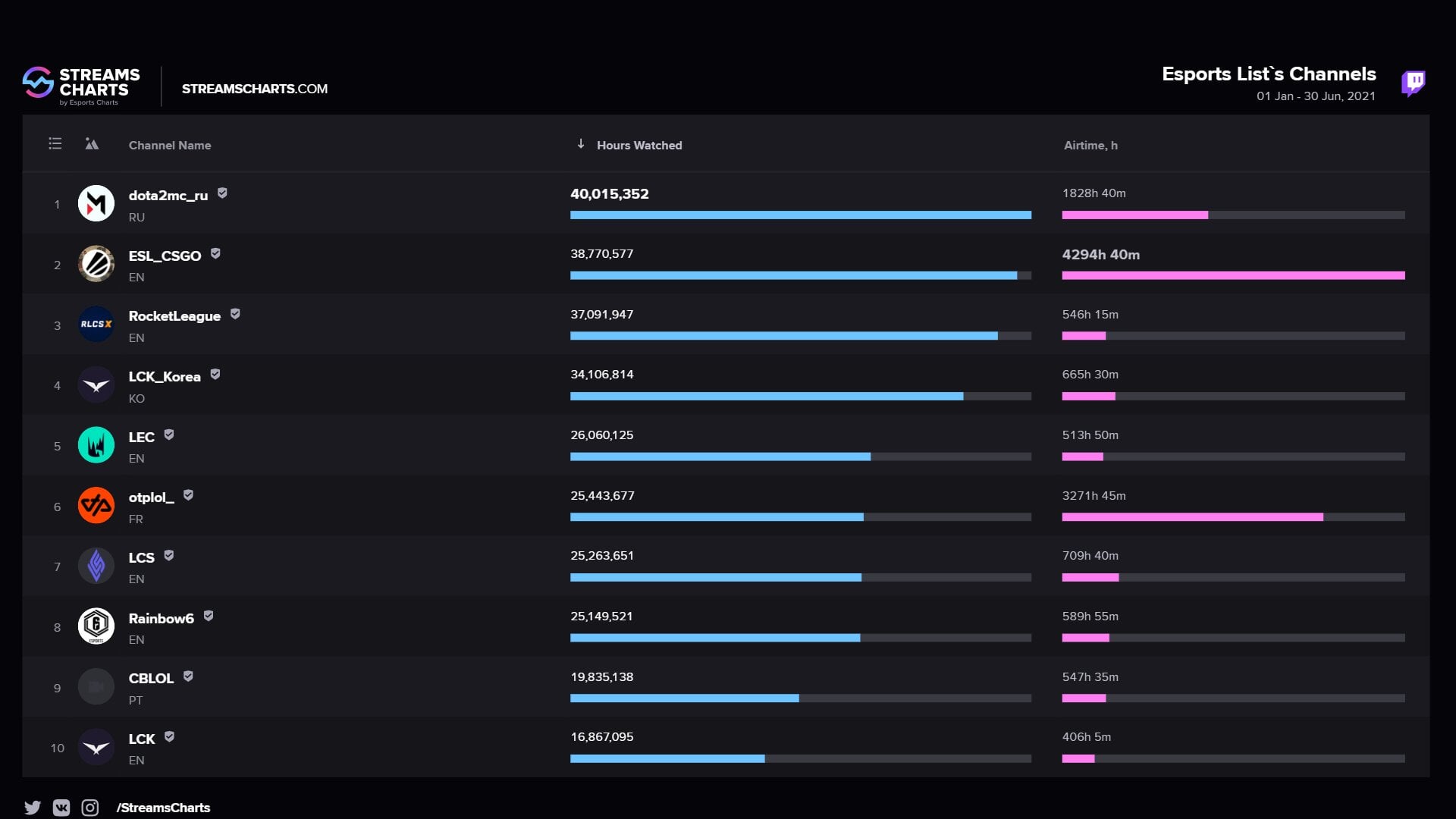 В пятерку лучших также вошли каналы трансляций турниров по League of Legends – LCK (34 млн часов) и LEC (26 млн часов).