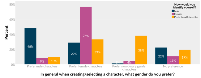 76% женщин сделали выбор в пользу персонажа женского пола, 9% выбрали бы мужского персонажа, для 11% безразличен гендер игрового героя.