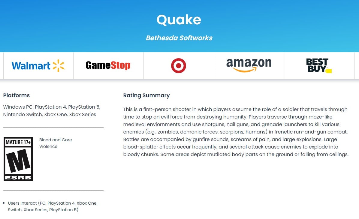 Североамериканская классификационная организация выдала возрастной рейтинг версиям Quake для ПК и консолей текущего поколения.