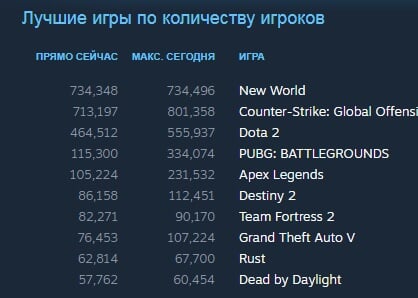 Текущий онлайн New World – 734 тысячи игроков. CS:GO (713 тысяч) и Dota 2 (464 тысячи) идут на второй и третьей строчке топа.