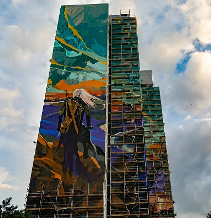 Произведение расположилось на стене 26-этажного дома. После завершения работ фреска станет самым большим артом по «Ведьмаку» в мире.